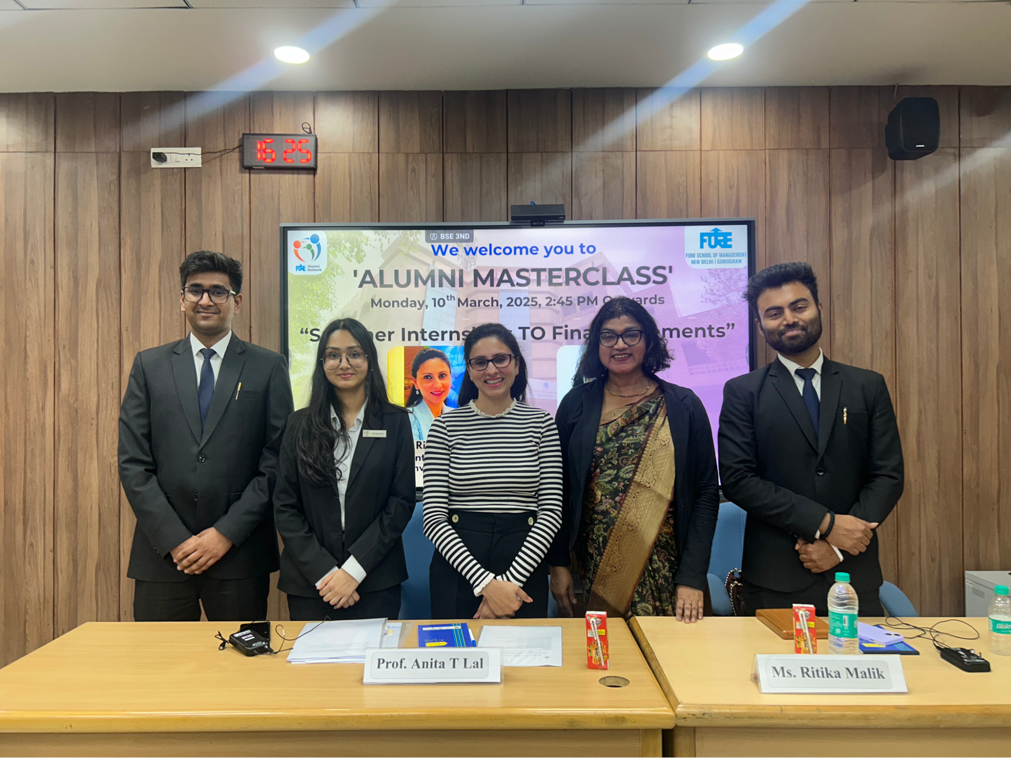 The FORE Alumni Network successfully hosted the Alumni Masterclass on March 10, 2025, at the FORE Gurugram Campus. The session, led by Ms. Ritika Malik, Vice President – Human Resources, Amway India, and Dr. Anita Tripathy Lal, Chairperson, FORE Alumni Network, offered students valuable insights on navigating Summer Internships (SIPs) and maximizing them for final placements.