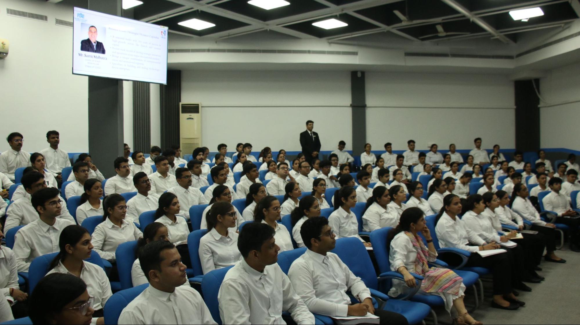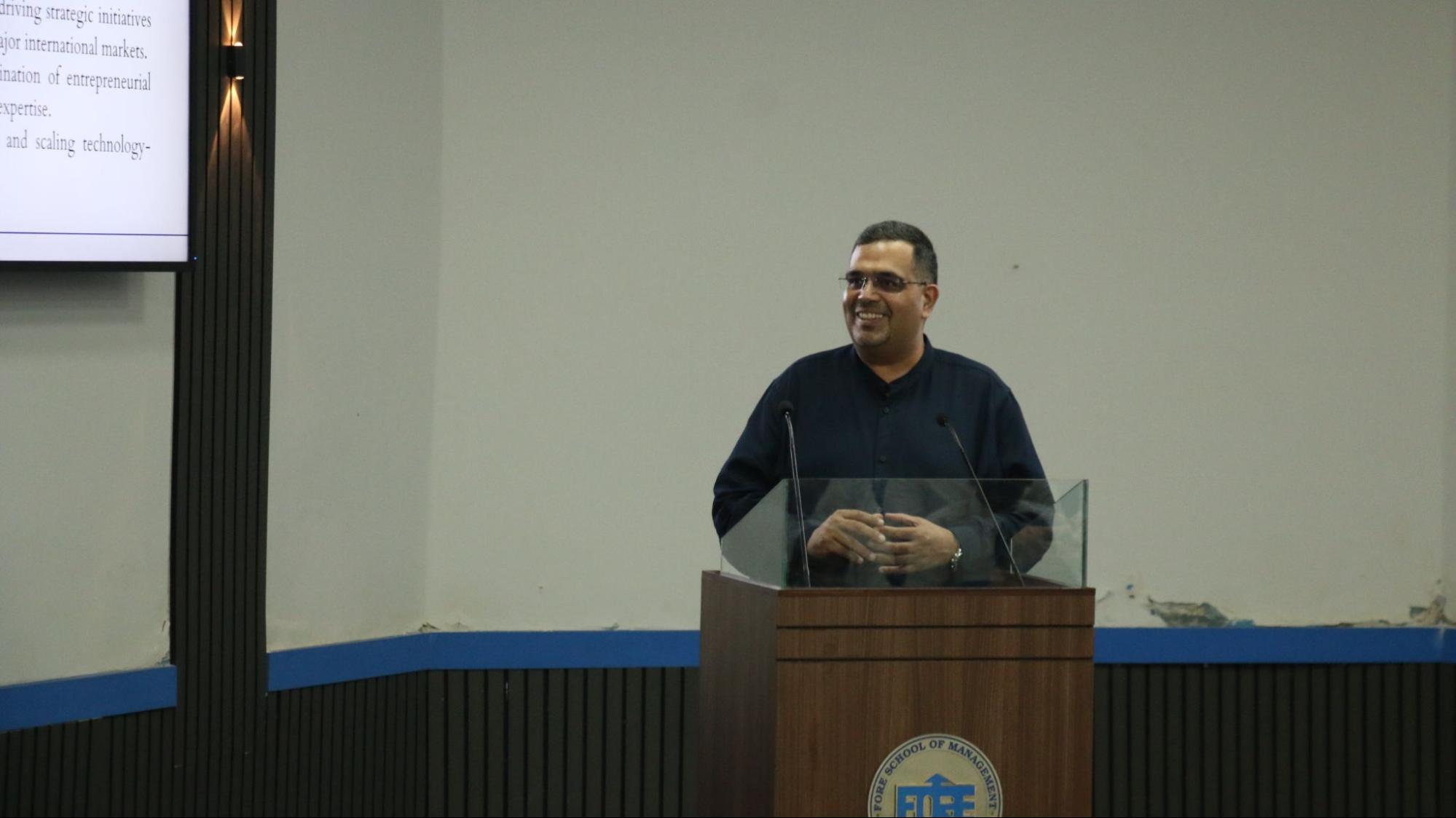 The event featured Mr. Sumit Malhotra, Chief of Staff at Iron Pillar and an esteemed alumnus from the Class of 2002, who addressed an audience of over 190 students on the theme “Lessons in Global Business: Leadership, Adaptability, and Growth Across Industries.” Mr. Malhotra, with more than two decades of global experience spanning venture capital, fintech, and private banking, shared valuable insights on leadership, perseverance, and professional growth. Through engaging anecdotes from his diverse career across India and the Middle East, he highlighted the importance of adaptability, continuous learning, and building strong professional relationships.