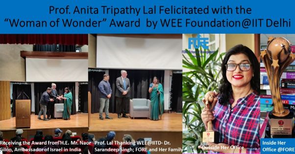 1. April 30, 2022- Felicited by WEE Foundation @FIIT, IIT Delhi with the prestigious Award “Woman of Wonder” for outstanding contribution towards Mentoring the WEE Women Entrepreneurs since their inception in 2016. The Award was presented to her by the Ambassador of Israel in India, His Excellency Mr. Naor Gilon during WEE Foundation’s flagship Entrepreneurship Event in partnership with the Embassy of Israel.